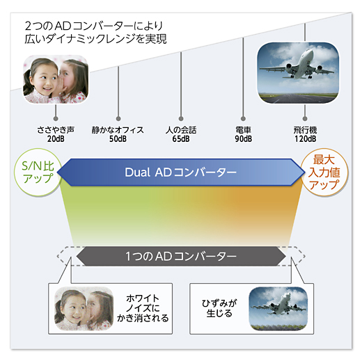 2つのADコンバーターがシームレスな連携を保ちながらシステム連動することで、1つのコンバーターでは実現できない「幅広いダイナミックレンジ」と「高いS/N比」を実現。ささやき声のような小さな音から、ジェット機のエンジン音のような大きな音までひずみの少ない自然な音で録音できます。
