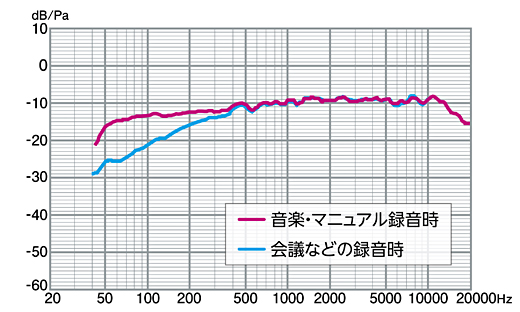 「音楽」シーンやマニュアル録音時には、「Microphone Frequency Optimizer」機能が働き、原音に忠実な録音ができます。また、「会議」や「インタビュー」などの録音シーンでは、音声帯域に適した周波数特性になります。