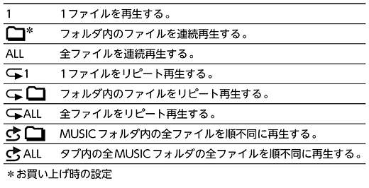 1ファイルのみの再生やフォルダ内のファイルの連続再生、MUSICフォルダ内の全ファイルのリピート再生やシャッフル再生などができます。