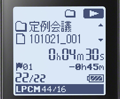 従来比(*)約1.5倍の大画面ディスプレイを採用。録音データのファイル名やフォルダー名、メニュー画面などを日本語で表示し、ファイルの管理も簡単です。MP3ファイルに記録された曲名やアーティスト名などの表示もできます。