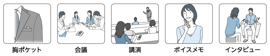 こすれ音の低減に有効なノイズカットフィルターが入った「胸ポケット」や、ビジネスシーンに便利な「会議」、「講演」、「ボイスメモ」、「インタビュー」の5種類の録音設定を搭載。さまざまな録音シーンに合わせて、録音モードやマイク感度などの録音に必要な項目を、一括でおすすめの設定に切り替えられます。