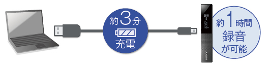 リチウムイオン電池を採用し、付属のUSB接続ケーブルを使ってパソコンと接続するだけで、USB充電が可能です。約3分の充電で約1時間の録音が可能な急速充電対応なので、急な会議などにも対応できます。