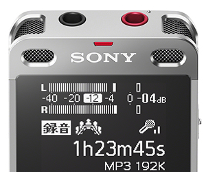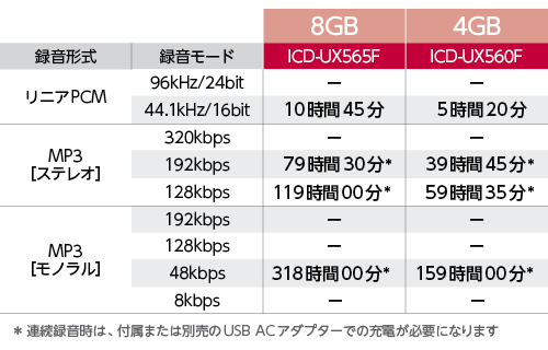 汎用性の高いMP3形式での録音に対応。MP3録音形式(192kbps)で、会議や講演会などをICD-UX565Fなら79時間30分(*)、ICD-UX560Fなら39時間45分(*)録音できます。