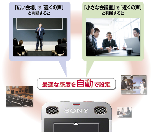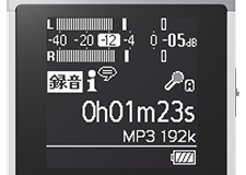 録音の際、入力音圧レベルを適正に判断して最適なマイク感度を自動で設定。わずらわしい感度設定を行わなくても自動的に適切なレベルで録音できるので、録音した音が小さすぎる(大きすぎる)などの設定ミスを防げます。