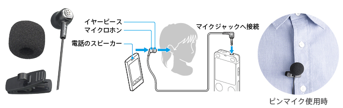 受話器をあてる側の耳にマイクロホンを装着して、携帯電話や固定電話での会話を録音できます。クリップ・ウインドスクリーンも付属しているので、ピンマイクとしても使用できます。