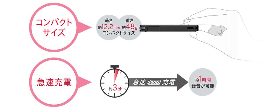 薄さ約12.2mm、重さ約48gのコンパクトなボディは持ち歩きにも便利。約3分の充電で約1時間の録音ができる「急速充電」にも対応しているので、急な会議などの際もすぐに使えます。