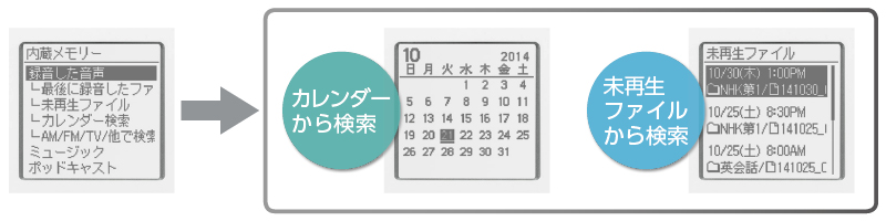 放送局名から探す「放送局別」、録音日時から探す「カレンダー検索」、「未再生ファイル」、「最後に録音したファイル」などの方法で録音済のラジオ番組を簡単に検索できます。