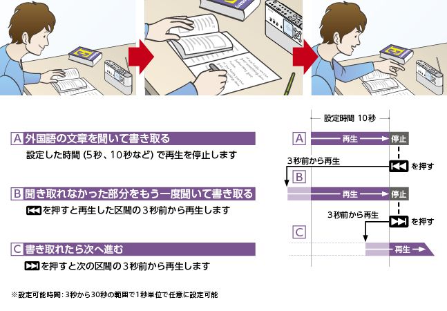 聞き取りと書き取りを繰り返すことでリスニング能力を身につける語学学習方法「ディクテーション」学習向けの再生機能を搭載。音源を一定の区間で区切って繰り返し再生できるので、録音したラジオやワンセグTV音声放送の語学番組を教材にして効果的に学習できます。