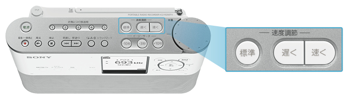 音程は自然なままで再生スピードを可変できる「速度調節(再生速度を1/2倍速から2倍速(*)まで21段階に設定可能)」を搭載しているので、語学講座の録音ファイルなどを自分に合った速さで聞くことができます。