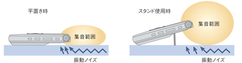 マイクに角度をつけて集音効果をアップ。机やテーブルからの振動ノイズも低減して、高音質なステレオ録音が可能です。