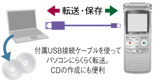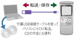 付属のUSB接続ケーブルでパソコンと接続して、録音したデータをパソコンに転送・保存できます。付属のパソコン用ソフトウェア「Digital Voice Editor Ver.3.3」を使ってCDの作成も可能です。