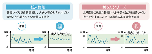 より原音に忠実な録音レベルを保ちながら録音レベルを平均化することで、臨場感のある録音ができます。