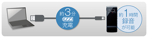 リチウムイオン電池を採用し、約3分の充電で約1時間の録音が可能。急な会議などにも対応できます。