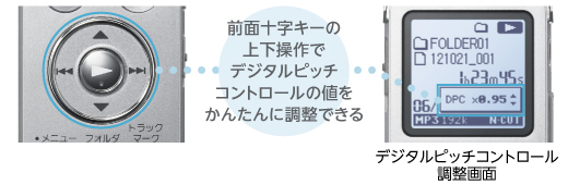 新しいボタン形状で操作性を向上させた前面十字キーは、携帯電話のように直感的な操作が可能。自然な音程で遅聞き、早聞きができるデジタルピッチコントロールの値も上下キーで調節できます。