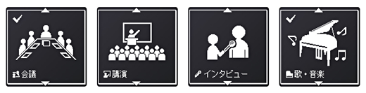 「会議」、「講演」、「ボイスメモ」、「インタビュー」、「歌・音楽」、「Myシーン1」、「Myシーン2」の7種の録音設定を搭載。さまざまな録音シーンに合わせて、録音モードやマイク感度などの録音に必要な項目を、一括でおすすめの設定に切り替えることができます。