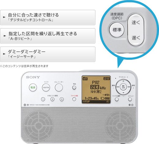 音程は自然なままで再生スピードを可変できる、「デジタルピッチコントロール(再生速度を1/2倍速から2倍速まで21段階に設定可能)」を搭載しているので、語学講座の録音ファイルなどを自分に合った早さで聞くことができます。