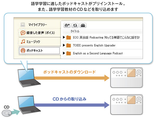 さらに、ポッドキャストコンテンツのダウンロード、管理、およびICレコーダーへの自動転送設定も可能です。
