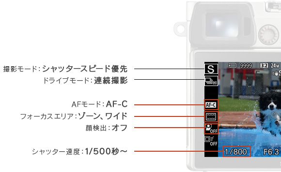 元気に走り回る犬の撮影には、シャッター半押し中ずっとピントを合わせ続ける[AF-C]がおすすめです。動きの予測がつきにくいので、フォーカスエリアは[ワイド]にしておくとよいでしょう。元気に走ると想像以上に速いので、1/500秒以上のシャッター速度でドライブモードは[連続撮影]にセットし、とにかくシャッターを押し続けてください。