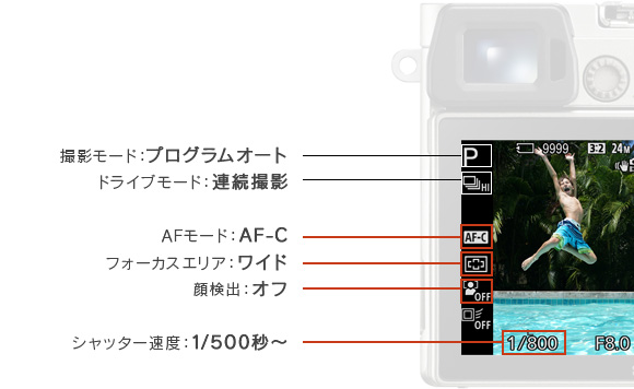 複数の子供を同時に写す場合、動きの予測がつきにくいので、フォーカスエリアは[ワイド]にセットすることをおすすめします。AF モードは[AF-C]、顔検出は[オフ]にしてください。周囲の風景といっしょにやや広めに撮りたい場合は、1/500秒以上あれば十分ブレずに仕上がります。