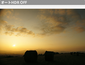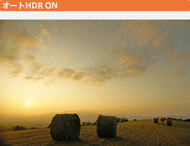 | 夕焼けの雰囲気や雲の輪郭まで写そうとすると、逆光で暗くなった草原の部分が黒くつぶれてしまう | 「オートHDR」機能を使えば、夕焼けの空や雲のディテールを残しながら、逆光で黒くつぶれていた草原も、より鮮明に再現できる | ||