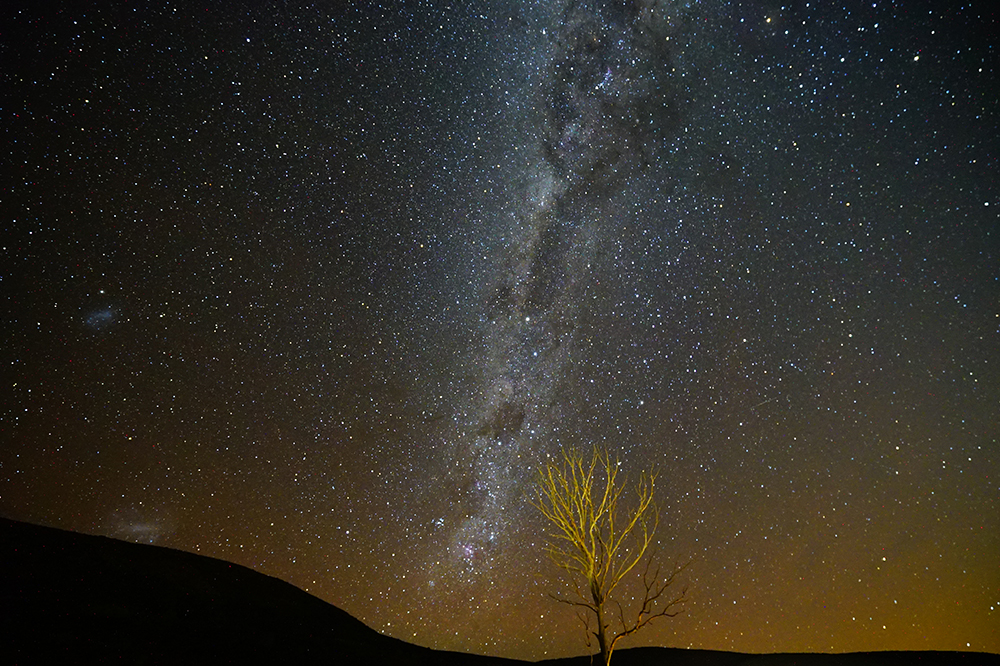 電子ビューファインダーの利便性を更によく感じるのは、こういった星空を撮るときです。これは南アフリカの自然保護区で天の川とマゼラン星雲を撮影しています。ここではピーキング機能を使って、天の川にしっかりとピントを合わせています。実は星やオーロラを撮るとき「無限遠にして、絞りは開放にして、写真を撮ってください」と話している方が多いんですが、今のカメラって無限遠にしちゃうと僅かにピントがずれるんですよ。そこから、ほんのちょっとですけど戻すとピントが初めて合う。 それがレンズによって、遊びが大きなレンズもあれば小さいレンズもあって。でも一眼レフだと、真っ暗闇の中でファインダーを覗いても、無限遠でちょっとピントがずれているかなんてわからない。だから結局、撮影した後に拡大して再確認する。この作業をくりかえす時間もムダだと思います。そういうときに、αの電子ビューファインダーと液晶なら、拡大表示できますし、ピーキングで星が赤や黄に色付けられるので、確実にピントが合わせられ、非常に助かっています。失敗が無い。 それから、フィルムの時はISO1600くらいまでしかフィルムの感度を上げられなかったので、絞りは開放、が定番だったんです。でも今は別にISO1600よりも上に感度を上げられるので絞っても良い。むしろ絞った方が良いっていうか。全部がズバッと合ってくるために、F8くらいまで絞ってみてください。この写真は、大地までピントが合っていると思います。