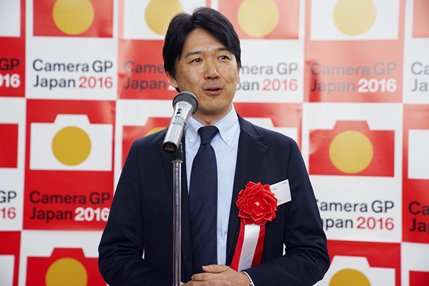 カメラグランプリ2016実行委員長福田祐一郎氏から賞状と盾を授与された『α7RⅡ』。イメージング・プロダクツ&ソリューションセンターデジタルイメージング本部第1事業部2部ILCビジネスユニット長の田中健二は、受賞の喜びをこう語った。