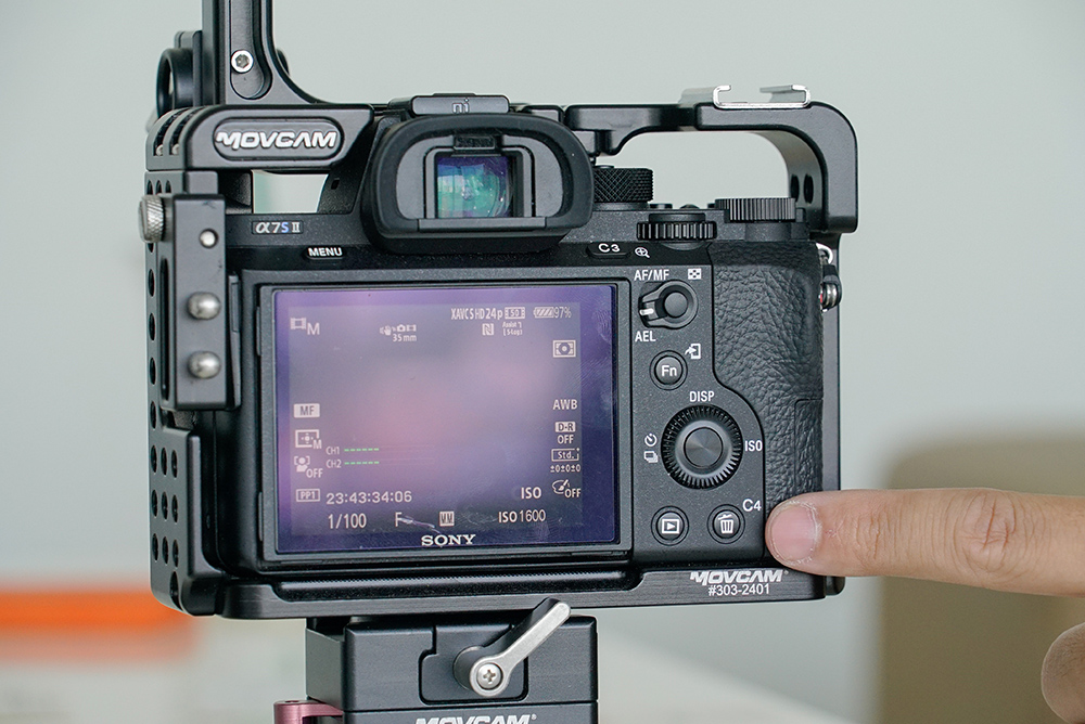 ケージはムーブカムのα7S Ⅱ専用のものを使用しています。手ブレをおさえるビデオ撮影ならではの持ち方ができ、モニタ―もつけられます。不注意でカメラを落としたときのガードになりますし、装着した状態でバッテリーの交換が可能、ライトもつけられます。