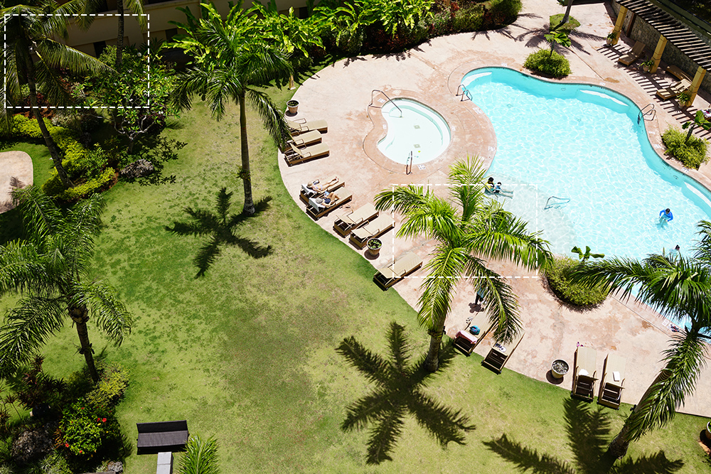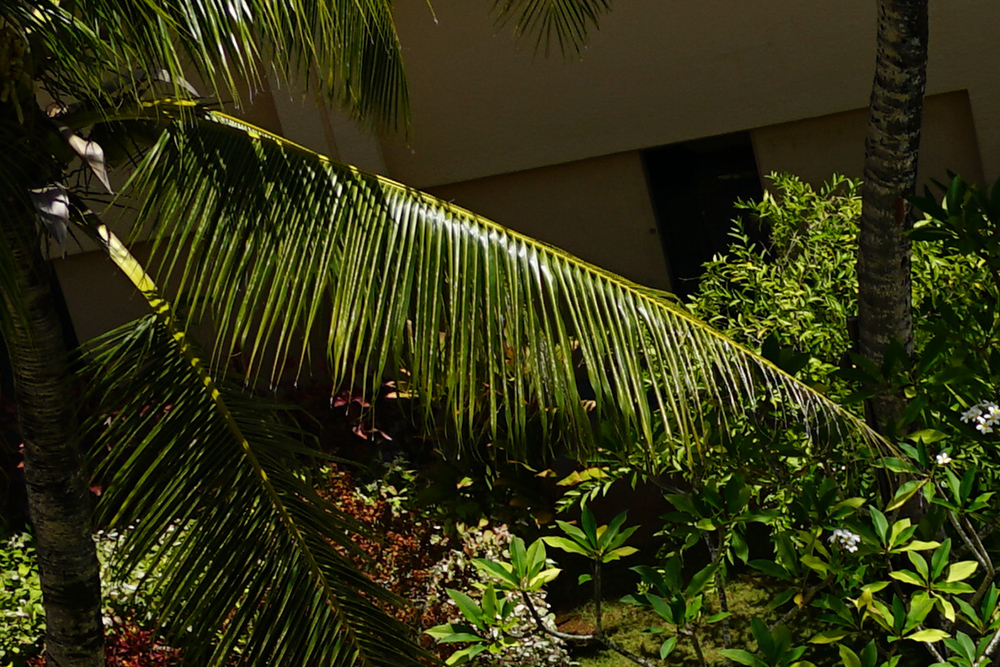 例えば・・・この写真は、朝起きてホテルの窓から何気なく撮った写真ですが、なかなか気に入っている一枚です。真ん中の木を拡大してみると葉っぱ一枚一枚の質感や萎れ具合までしっかりと表現されています。ただ、これは画面の中央部分ですから最近のちょっと良いカメラなら真ん中はしっかりと解像するんですよね。