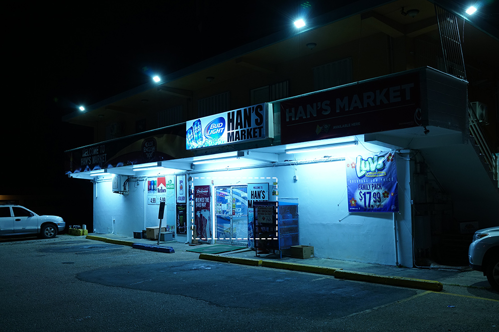 この写真はグアムのコンビニ・・・ですかね。ホワイトバランスを電球に設定して、ISOを1000まで上げて撮影しました。暗所での撮影でしたが、ノイズがのることなく、ドアに貼られたチラシの一枚一枚の文字までしっかりと描写されています。