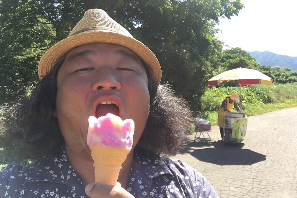 撮影はすこぶる快調です!この写真を見ていただけたらきっと皆さんも確信されたことでしょう。ところで絶好調の僕がほおばってるアイスは「ババベラ」と呼ばれるアイスです。これを聞いてピン!と来た人もいるかと思いますが、今回僕が夏を追いかけて辿りついたのは秋田県です。この地で、美しい夏の鉄道風景に出会いたいと考えました。