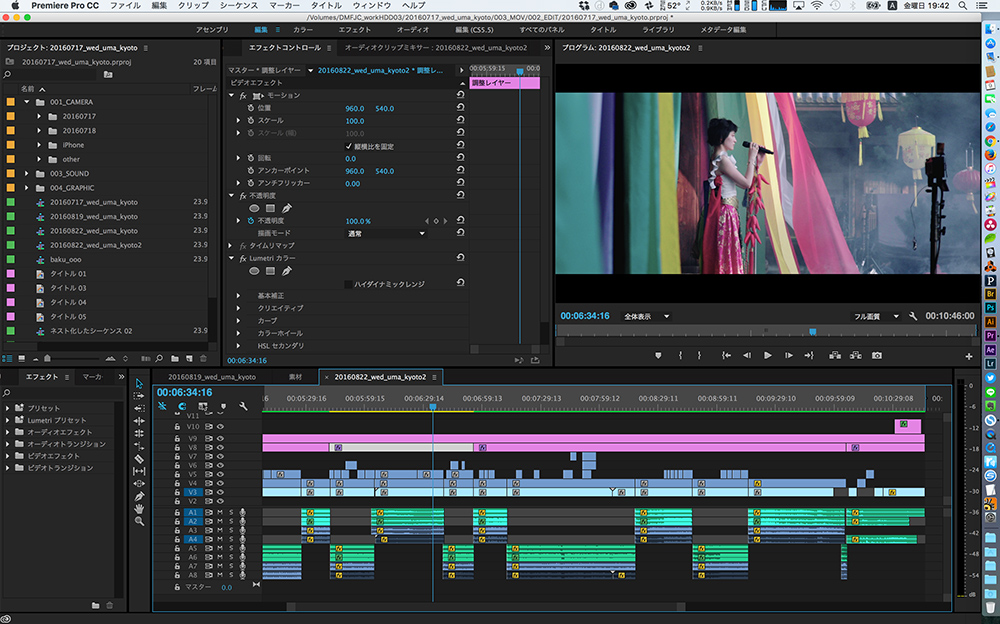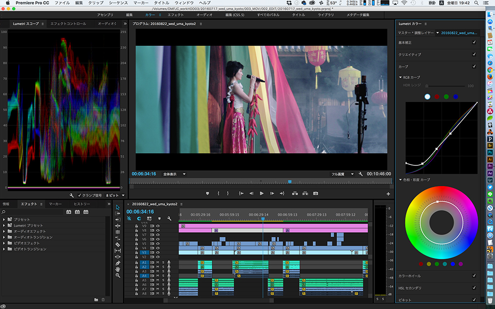ソニーのLUTは、カラコレの前段階として色を整えてくれるLUTなので、まずはシーケンスに並べた素材全体に同じLUTを当てています。その後で、各カットひとつずつトーンカーブで色の調整をしていきます。これまでも各カットごとにカラコレをしていたので手間は変わらないのですが、色の再現度を容易にするLUTを使うことで、すごく楽になりました。