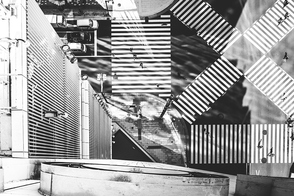 ソニービルを訪れた経験のある方はご存じだろうが、この建物は現在の建築基準ではもはや作ることのできないユニークな構造となっている。 その具体例の一つが、軸となる階段の周辺に、全25層のフロアが配置される「花びら構造」である。訪れたお客様が各商品のショールームを連続的に観覧できるようになっていた。 また、数寄屋橋交差点に面するコーナーには、三角形のイベントスペース「ソニースクエア」が据えられ、これまでに数多のイベントのステージとして活用され続けてきた。 今後人々が集うためのコミュニティスペースとして生まれ変わるにあたり、高木氏によって撮影された写真がこちらである。 さらに、今回のプロジェクトを契機に、ソニービル屋上から特別に撮影された「数寄屋橋交差点」の俯瞰カットでは、交差点に映る光と影の揺らめき…まるで水面のようにもみえる光景が写されている。これは、近年周辺に建てられた高層建築物に反射した光の効果であるという。