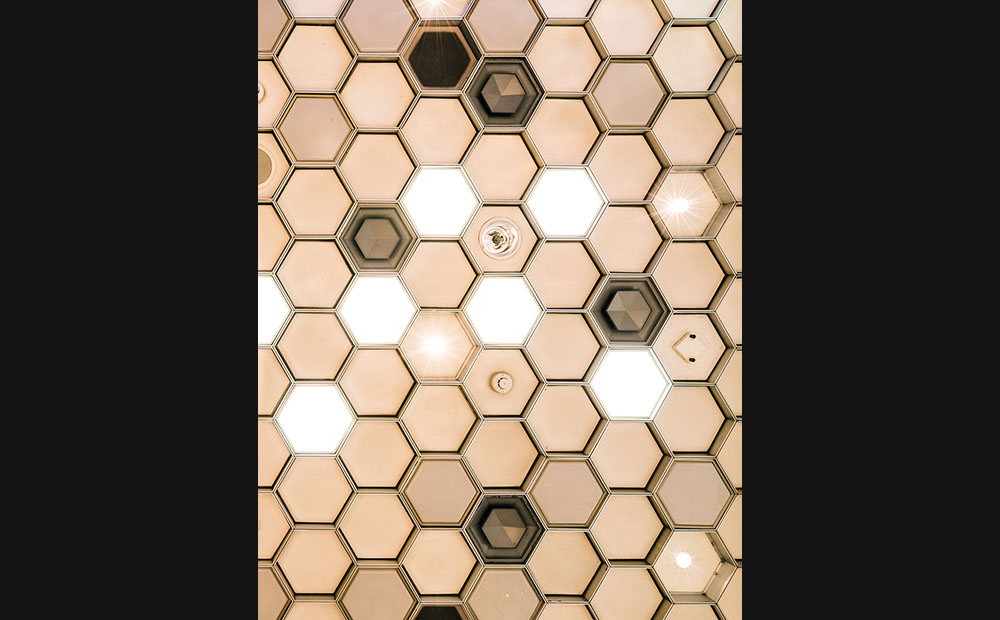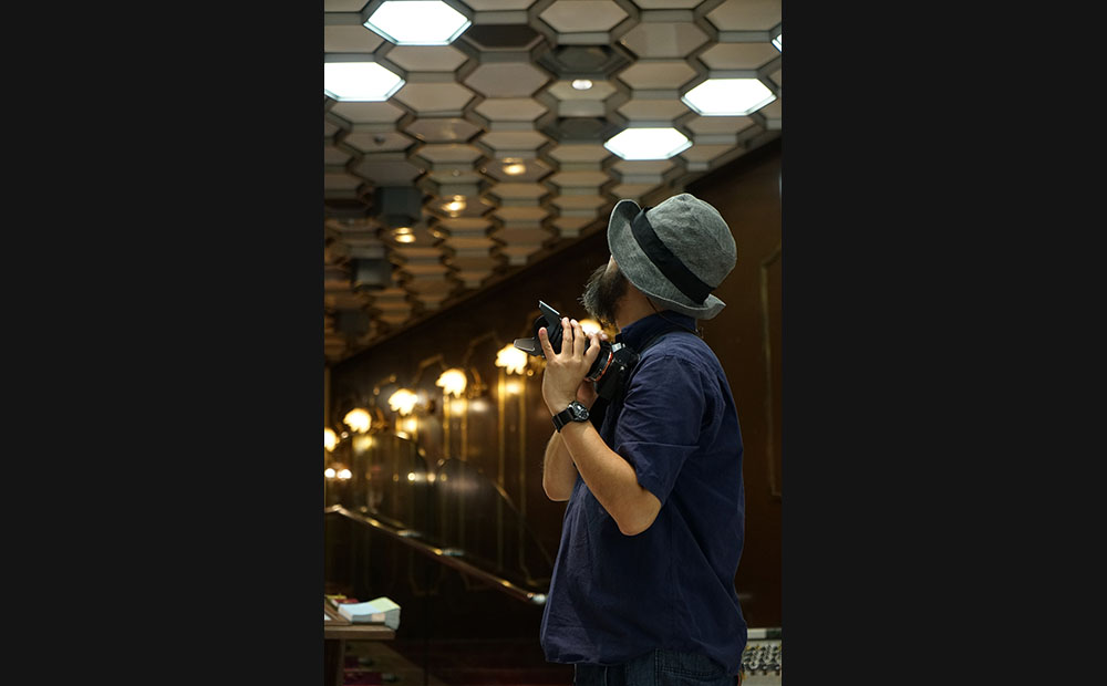 建物の内部に目を移しても、斬新なデザインが随所に織り込まれているソニービル。 続いて、高木氏が次に着目したのは、7Fのフロアから真上を見上げた際に目に飛び込んでくる「ハニカム(=六角形)」構造。 ライト、スプリンクラー、スピーカーなど、様々な構造物がランダムに配置されている様に、ある種の「生命感」のようなものも感じることができるという高木氏。 α7シリーズのダイナミックレンジの広さにより、逆光下でも照明の光・天井のデザイン共に、あますところなく記録してゆく。