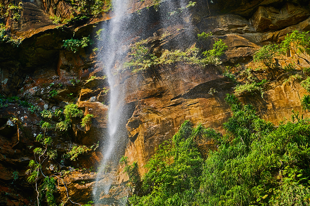 沖縄県で最大の落差を誇る滝ですから、最初は広角で滝全体を収めようと考え試行錯誤したのですが、流れ落ちる水が岩肌に当たっては砕け弾ける様と岩肌の質感を見ている内に考えが変わり、望遠レンズに付け変え、自分が感銘した要素にフォーカスすることにしました。結果として、ほとばしる滝の水滴、岩肌の立体感、私が感銘を受けたポイントを克明に描写してくれ、この構図で追い込んで良かったと思いました。