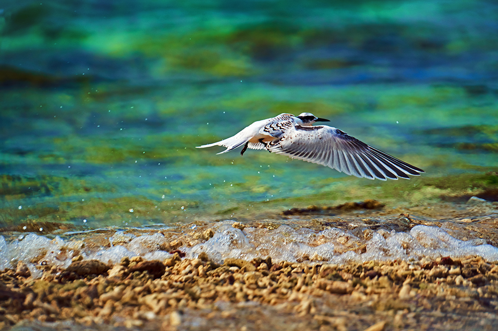 警戒心が強く無闇に近づくことは出来ないため、ゆっくりと海の中を進み私の身体の半身が海の中に浸かるくらいのところまで進んだところで、まさに思い描いた海面スレスレを飛翔し、羽根を拡げたその瞬間を捉えることに成功しました!