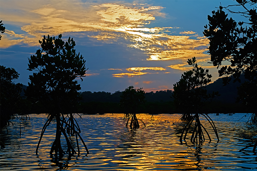 次の撮影地へ向かうためにカヌーを漕いでいると、キラキラと輝く水面と夕陽を浴びたマングローブのシルエットが眼前に現れました。