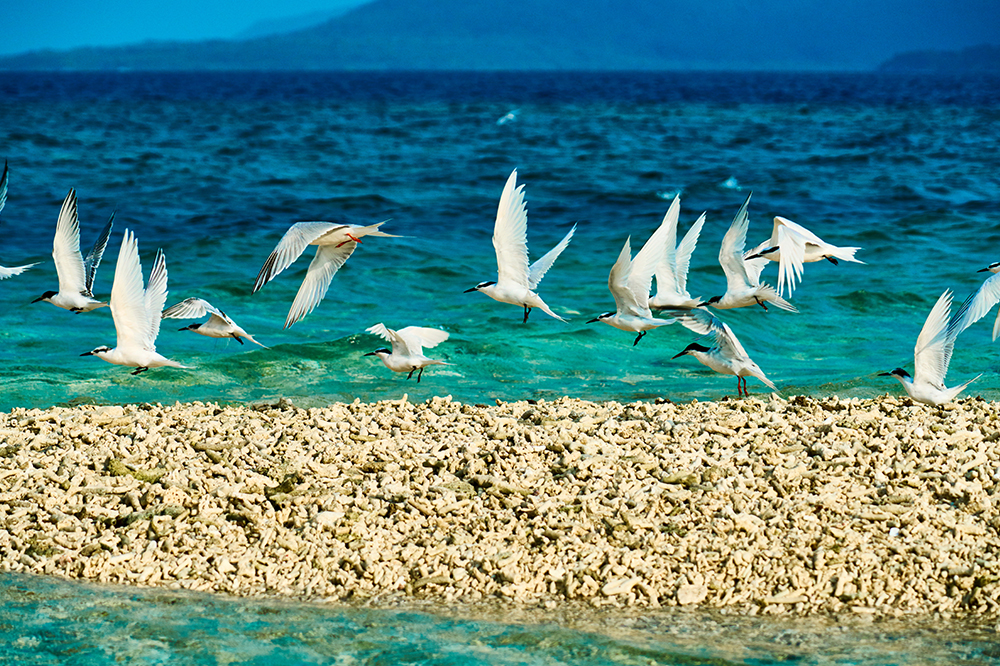 エメラルドグリーンの美しい海上を飛翔する姿を、今回はなんとしても撮りたい!と思い、西表島に隣接するサンゴの欠片でできた小さな無人島、バラス島に赴きました。