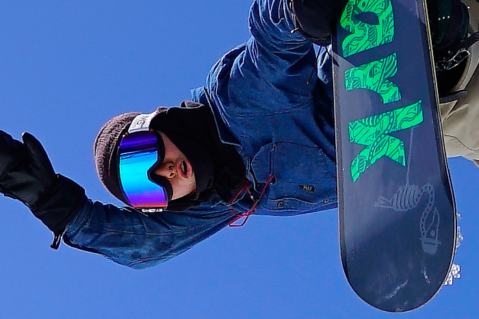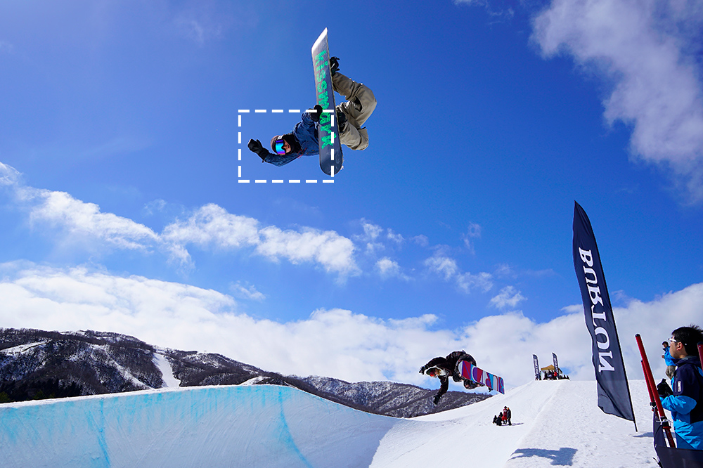 それは解像度と、オートフォーカスですね。 ピントを当てた選手は、ウエアーの素材まで伝わってきそうなくらいバリバリに解像しています。レンズも凄いんだろうけど、カメラの画素数が半端じゃない(*)。普段からフルサイズで撮っているけど、スノーボードの撮影で高画素のボディは使っていなかったんで驚きました。 オートフォーカスも、α6300も同じだったんだけど、なんと言ってもエリアが広い。上のカットもそうですが、一眼レフだと気を使う画面の上下方向の位置も、あまり気にせず撮影できました。もう一つオートフォーカスで関心したのは、バチっと合った時の精度です。このカットが撮れて、カメラで拡大したときにびっくりしましたから。「すごい解像感だな、、、(笑)」てね。