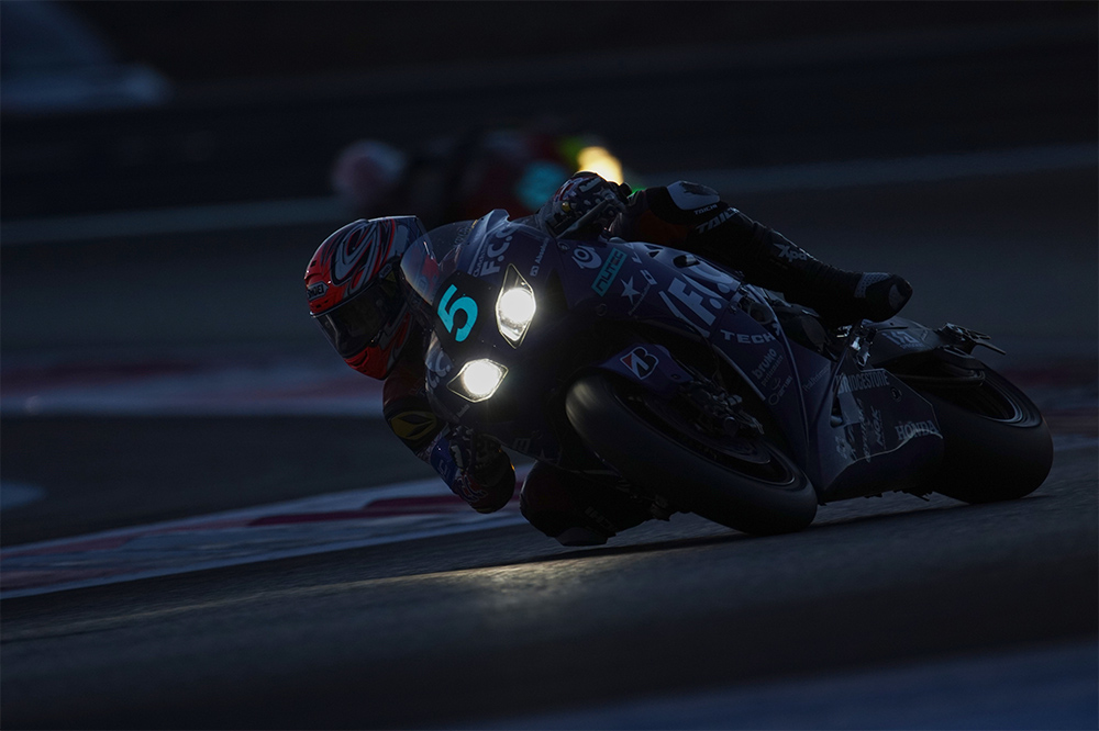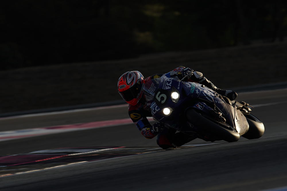 左の作品は、夜に撮影したのでヘッドライトの光とのコントラストが強い状況。でもAEで撮影しても露出は安定していましたね。右の作品は明け方に撮影したものです。現場はもう少し明るかったのですが、バイクのボディを照らしている朝日を強調したかったので、演出としてあえて暗めに仕上げました。暗い場所ではEVFも活躍してくれます。夜のサーキットは明かりが少なくて、撮りたい選手がどれなのかまったく見えないんですよ。バイクのカラーリングが地味だとなおさら見えない。でも、EVFを使えばヘッドライトしか見えない中でもゼッケンが見えます。肉眼で判別できないような暗い所でも、撮りたい選手を捕捉できたのは助けになりました。