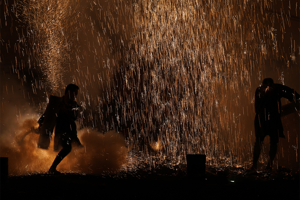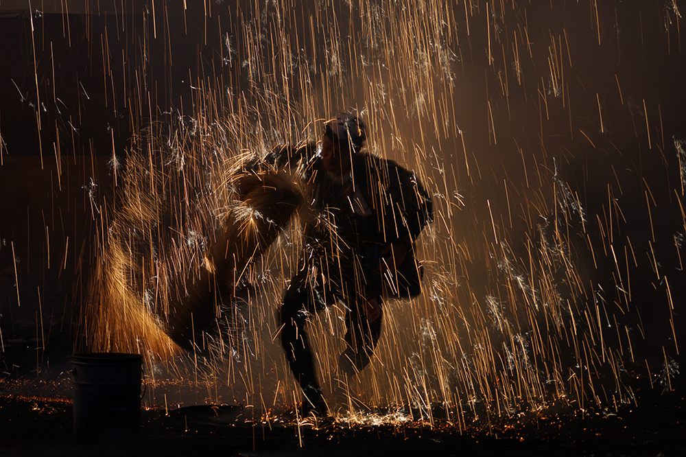 花火師が、打ち上げ後に火の粉の中を動いて出ようとしている作品です。Gマスター(FE 70-200mmF2.8 GM OSS)で撮影しました。