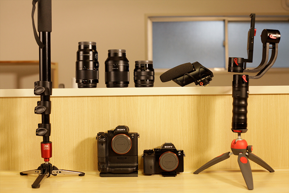 一脚や電子スタビライザー、ガンマイクも活用する。