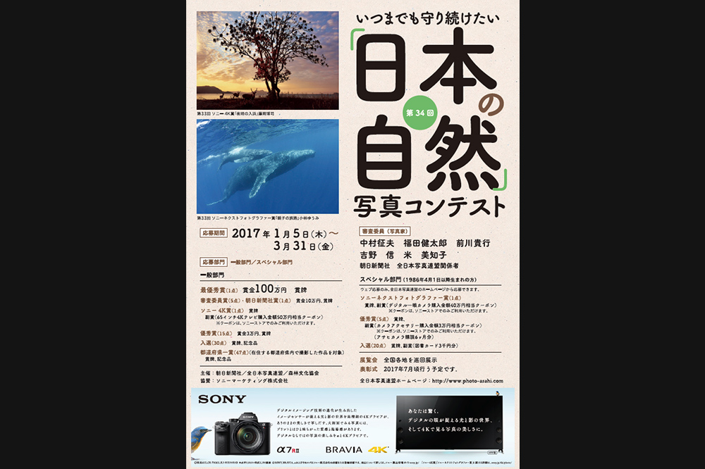 ソニーマーケティング株式会社は、朝日新聞社、全日本写真連盟、森林文化協会が主催する 『第34回 「日本の自然」 写真コンテスト』 に協賛します。