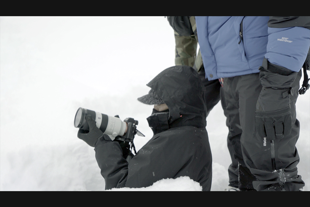 星川:雪の中のコントラストは白と黒の世界になるので、白飛びや黒つぶれに関しては気にしながら撮影しました。今回も、前回の西表島同様にカメラはα7S IIを使用したので、白飛び、黒つぶれさせずに白黒の陰影の世界を描き切るという面では信頼感があったんです。1日目に雪山で撮って、チェックして「これならイケる」と確信が持てました。