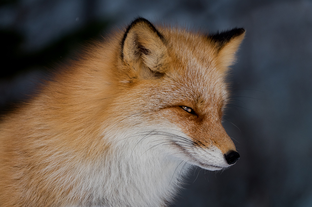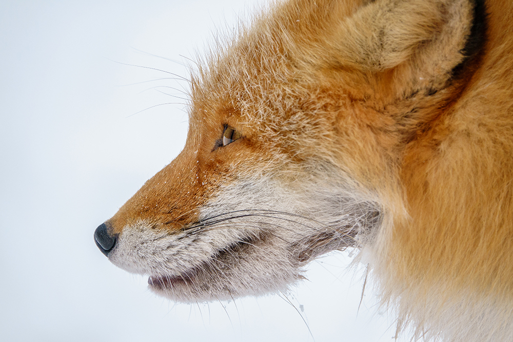 下の写真は、背景が日陰になっている場所で、1mほどの距離から望遠の400mmで撮影したもの。雪によるレフ板効果でキタキツネが明るく照らされています。RX10 IIIは24-600mmという超高倍率ズームレンズを搭載しているので、画角が自在なのも魅力ですね。後ろは若干灰色がかっているので、その灰色をグッと沈み込ませて印象的に仕上げました。