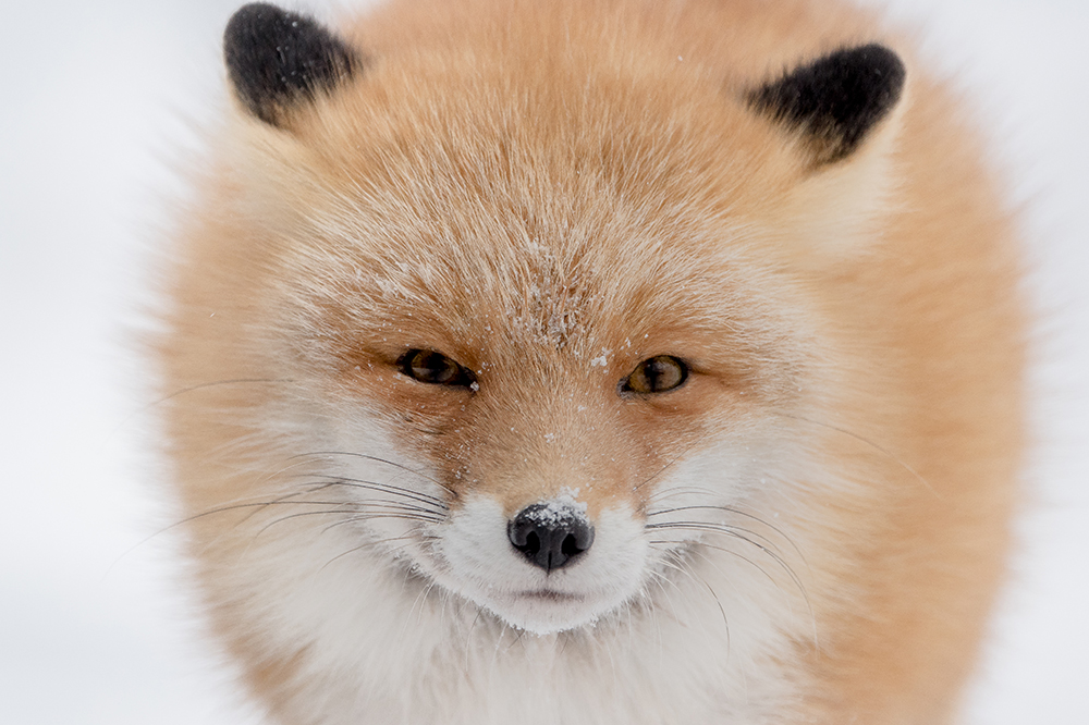 この余裕の表情がいいですよね。彼は知床のキツネで、その典型的な顔立ちをしています。美瑛のキツネは鼻がもっと高いんですよ。表情だけでなく、地域による顔立ちの違いがわかるのも、撮っていて楽しいものです。