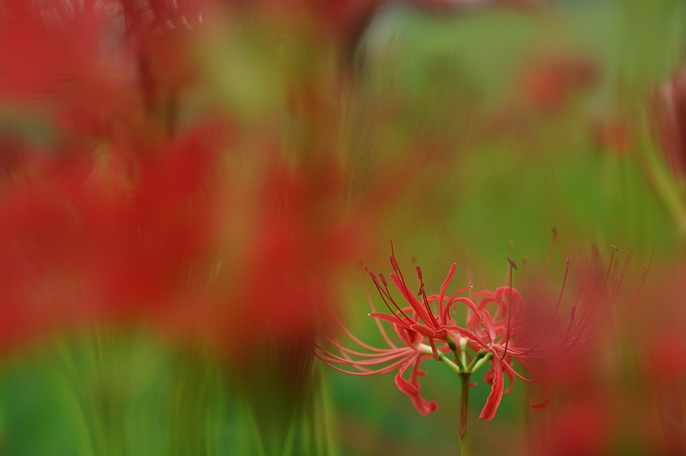 下の写真の彼岸花です。花芯のぼけが太くなっているところは、ふつうは二線ぼけになってうるさくなってしまうのですが、このレンズはハイライトとシャドウの部分が、滲んで溶け込んでいきます。右上の徐々に溶け込んでいく描写もSTFレンズならでは。彼岸花は前ぼけになると汚くなりがちですが、全部がふわっとぼけくれるのがいいですね。だんだん離れていくものが大きくぼけていくのに、それがスムーズにぼけていかないと綺麗じゃない。