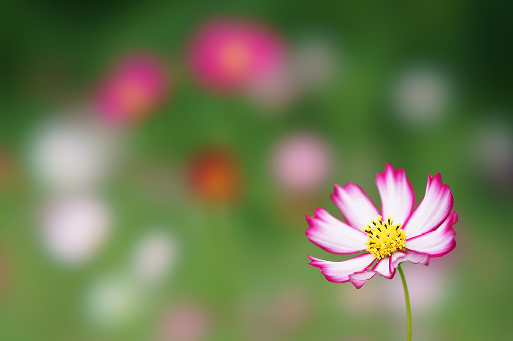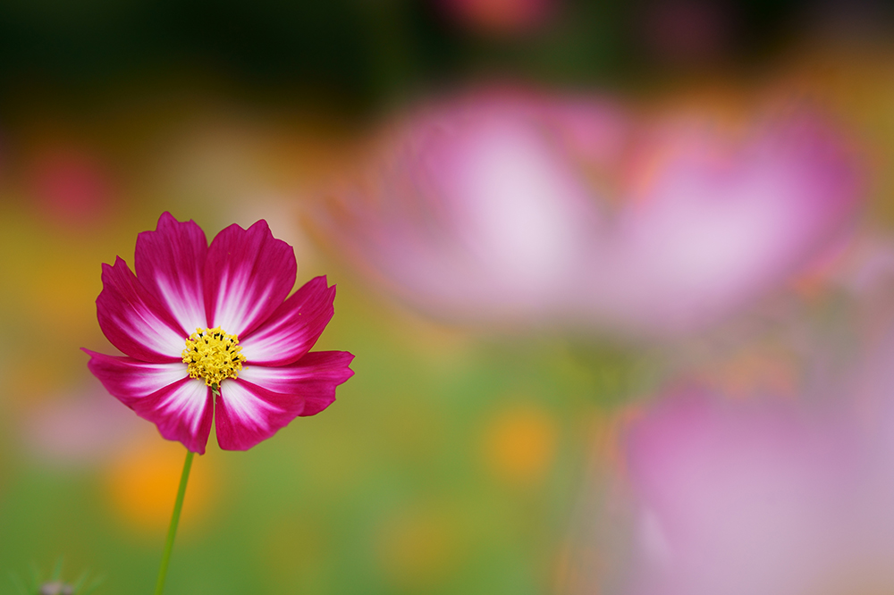 下のコスモスの写真です。強い点光源みたいなぼけを入れたときのやわらかさは格別でした。開放で撮ると、画面の端に口径食が必ず出てくるのに、STFレンズはそういうことがないですからね。