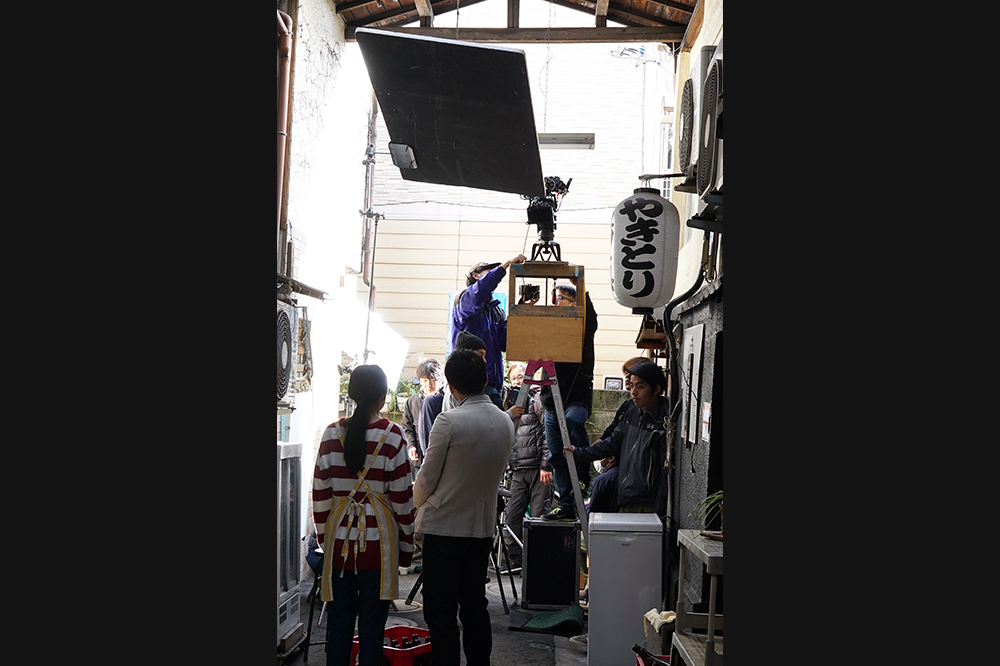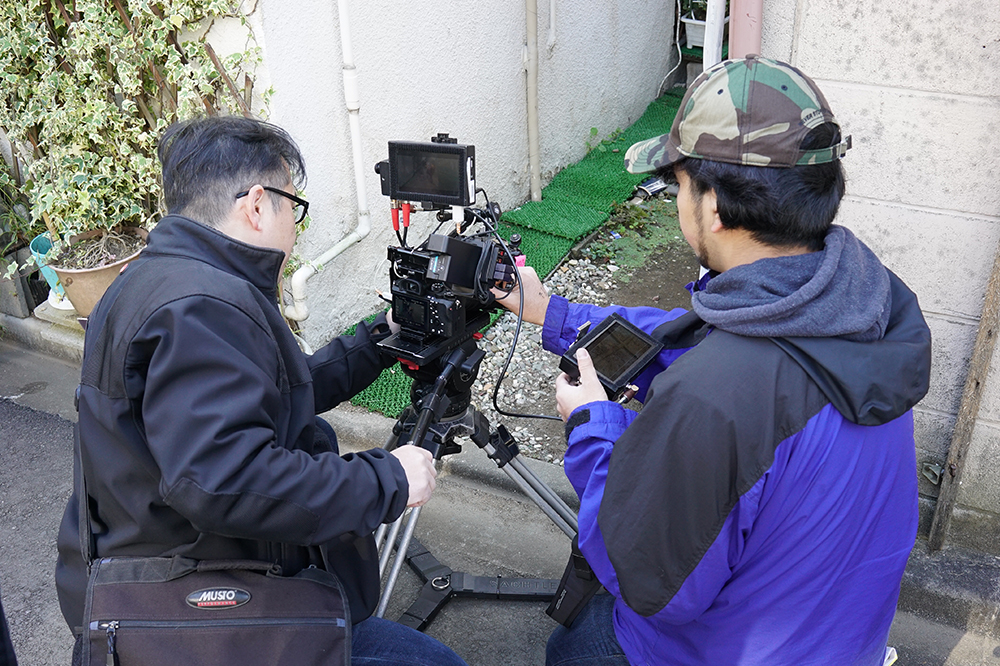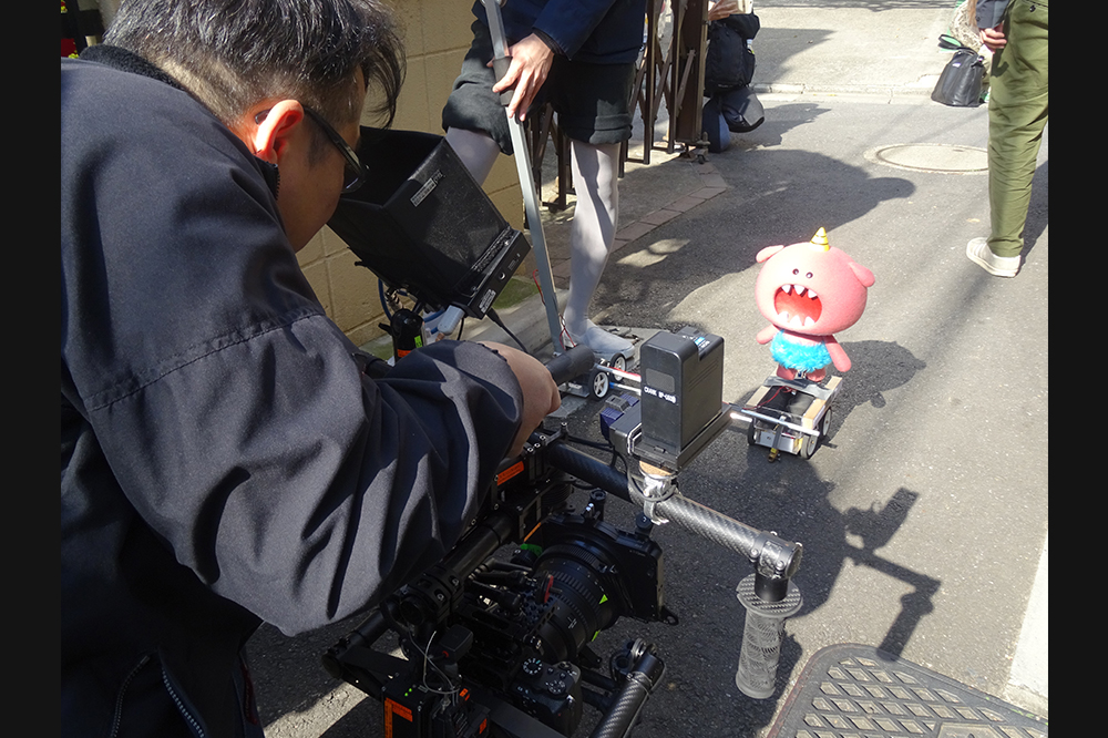 ――なかでもとくに思い入れのあるシーンや、印象に残っているシーンはありますか? 松:ひとつは、「とう」と「きょう」が追いかけっこをしているところ。カメラがずっと走り回っているのは、合田さんの作品ではあまりない画だなと思って、そこに新しさを感じました。もうひとつは「とう」が念を送るときに見せる、気合いが入った目つきですね(笑)。 合田:僕も追いかけっこは楽しかったですね。急カーブを曲がって走っていくシーンがあるんですけど、ただ走るんじゃなくて、ドリフトしてほしいと人形を操作する若手にお願いしたんです。操作する機械の下に鉄板を敷いて滑りやすくしたり、試行錯誤を繰り返して見事なドリフトを見せてくれました。 尾道:僕は何気ないシーンなんですけど、俯瞰のシーンに思い入れがあります。本当に脚立が立てられるか、立てられないかぐらいの狭い路地がクランクになっているところでしたが、監督が「ここは俯瞰で」と。普通だったらイントレ(鉄製パイプを使った足場)や脚立を立てるので、大きいカメラだと持ち上げるのも大変なんです。でも、α7S IIはひょいっと上げて撮れたので、このカメラでしか撮れない画が撮れたなという実感があります。路地裏で大きいカメラで撮るとなると人数も時間も必要なんですが、パパッと撮って移動できました。α7S IIは効率よく撮影することにも貢献してくれたと思います。