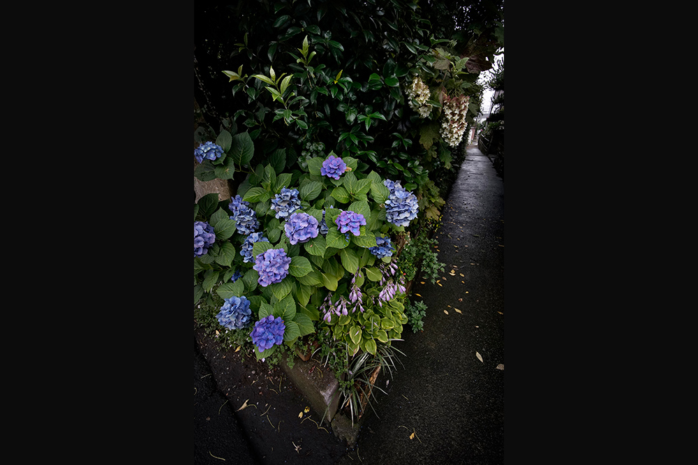 駅前を離れて、国道一号線の城山(じょうやま)の切り通しを抜ければ、旧東海道は一号線から別れて国府本郷の町を通る。このあたりは奈良時代に相模国の国府(今の県庁のようなもの)があったところ。街中を通る小道には軽自動車も通れないような古い道もたくさんある。鋭角に曲がるそんな小道の角に紫陽花が咲いていました。これは雨の日。雨の匂いと濃密な空気をを撮りたいと思いましたが、それを表すのに濡れて逆光に光る路面が役に立ってくれました。