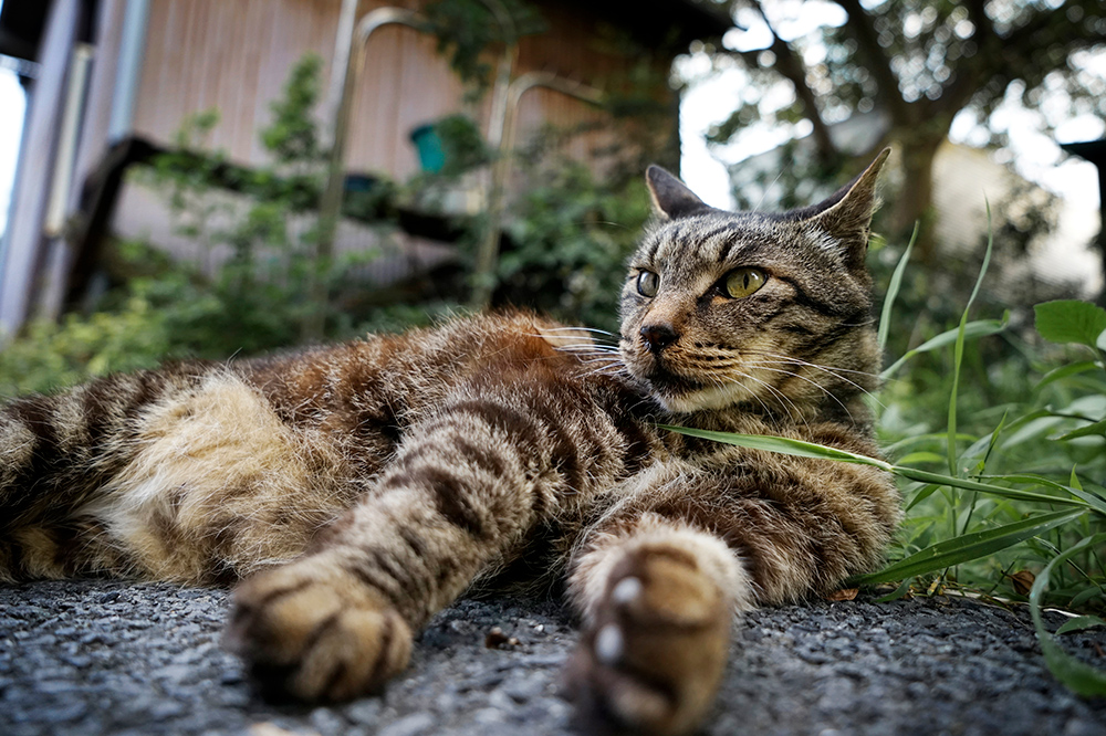 曇ってはいるが気温が高い日、大磯駅前から海に向かって下って行くと、港近くの下町の路地にノラが寝っ転がっていました。猫はこんな日、少しでも涼しいところをよく知っています。真似して寝っ転がってみると微かな風が頬を撫で、それがよくわかりました。小澤も猫になって塀の上を歩いたり、草むらで虫を追ってジャンプしたいけれど、そういうわけにもいきません。せめて一緒に寝っ転がってしばし猫になってみました。最初はよそよそしく警戒していた野良も、こっちを無視できるようになるくらいの時間、ネコパンチを食らわせられそうな距離で、お互い干渉し合わずにしばらく横になってみました。ワイドレンズのローアングルはこんな時の気分にピッタリです。